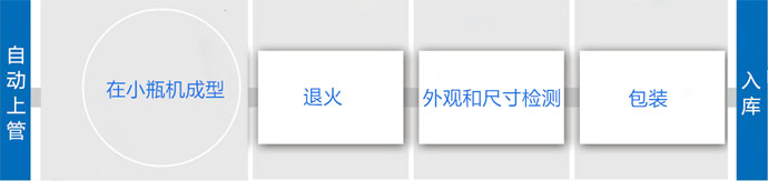從玻璃管生產(chǎn)出來之后,通過輸送鏈單根輸送到制瓶車間,再通過機器手插到機器上開始進行生產(chǎn)。然后進入遠紅外線電退火爐退火后,再進入在線攝像機檢測系統(tǒng)進行檢測,然后包裝入庫。
