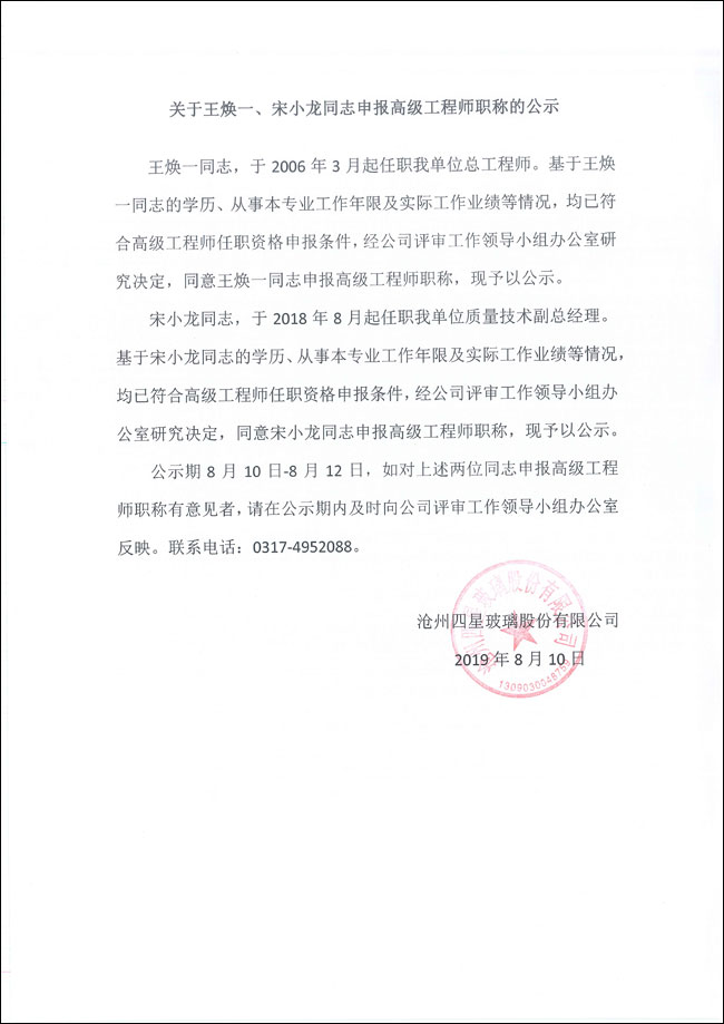 關于王煥一、宋小龍同志申報高級工程師職稱的公示